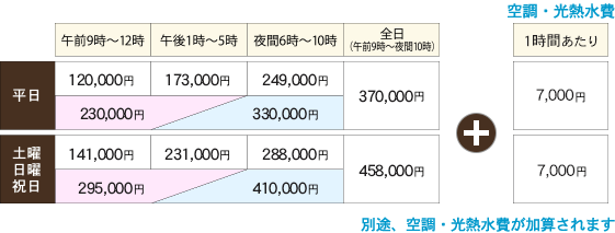 | 使用料金 | 下記料金表を参照ください。 ホール使用契約金は、契約区分会場費全額でお願い申し上げます。 |